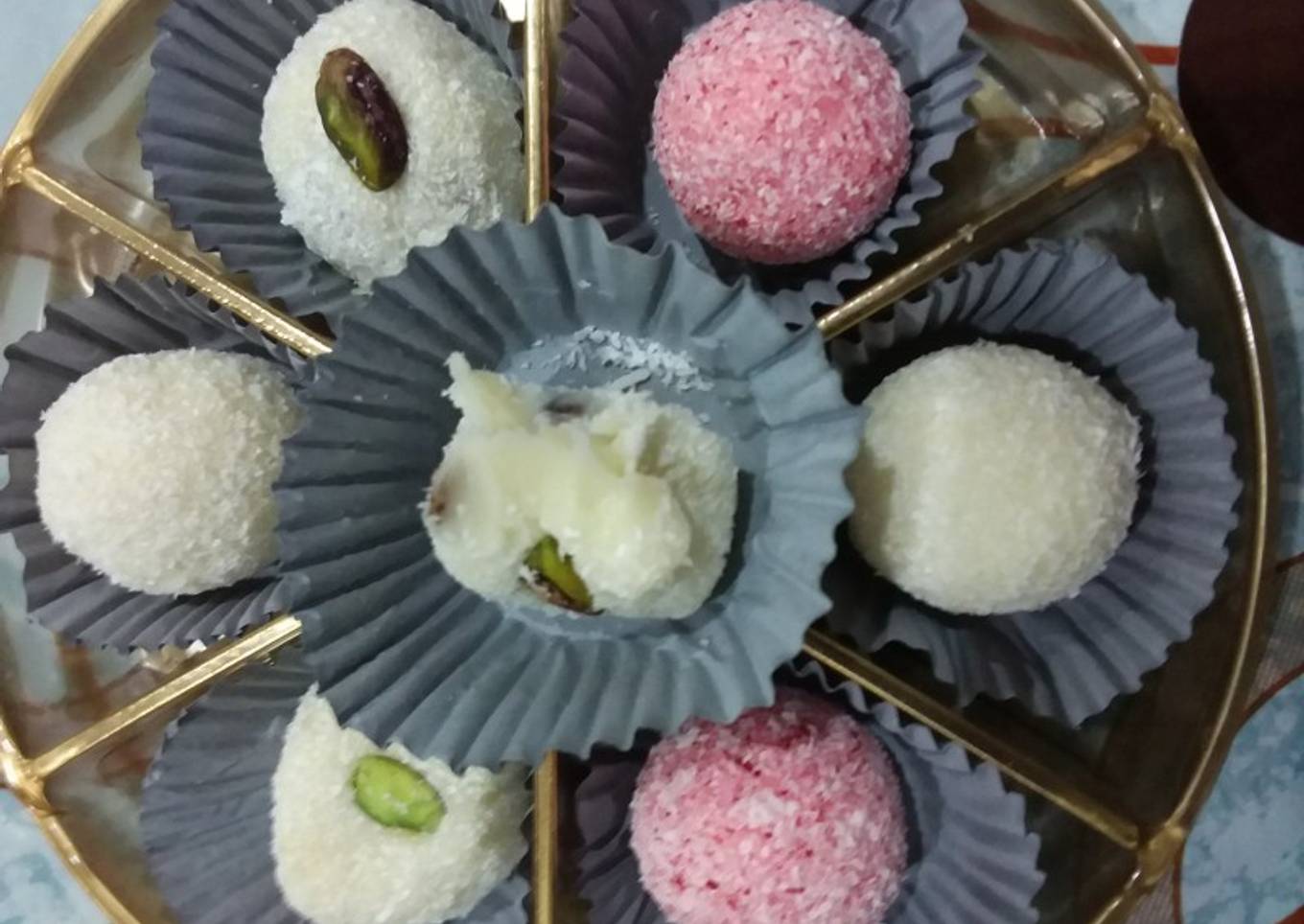 - On fait sortir notre truffes on forme de petites boules farcie avec le pistache et en robé là dans la noix de coco blanc et la noix de coco coloré