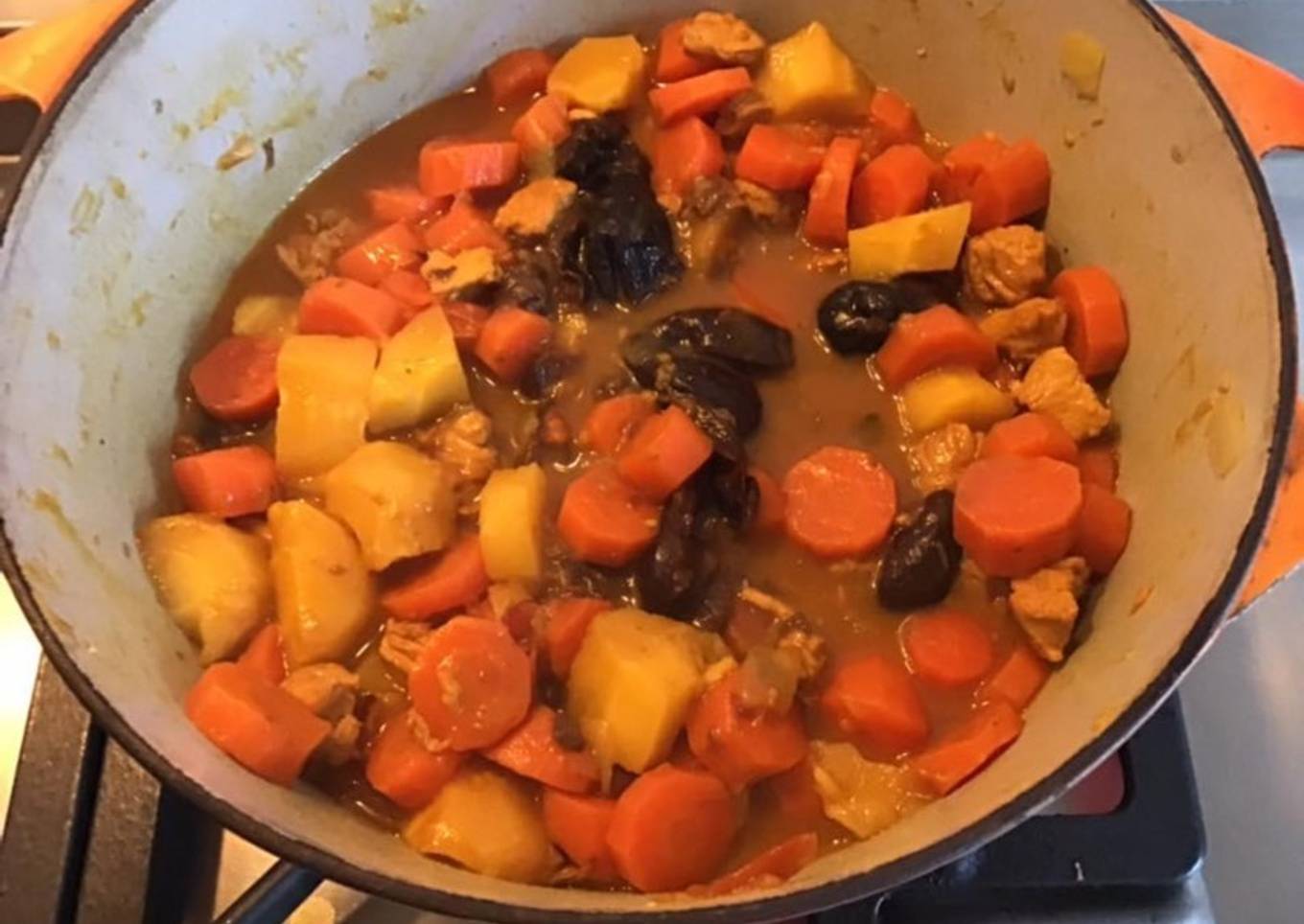 Tajine de poulet aux panais tomates pruneaux carottes miel et curry