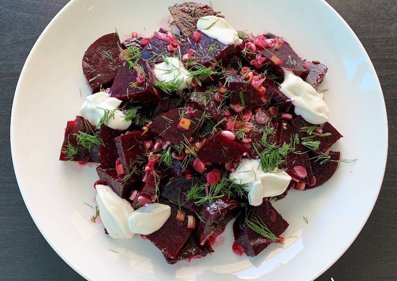 Versez l'huile tiède sur les betteraves. Ajouter l'oignon, le citron confit, le jus de citron, l’aneth 10g, saler et poivrer. Mélangez l’ensemble. Transférer ensuite dans une assiette de service. - Mélangez le yogourt et le tahini, mettre quelque cuire à différents endroits ajouter le reste de l'aneth par dessus.