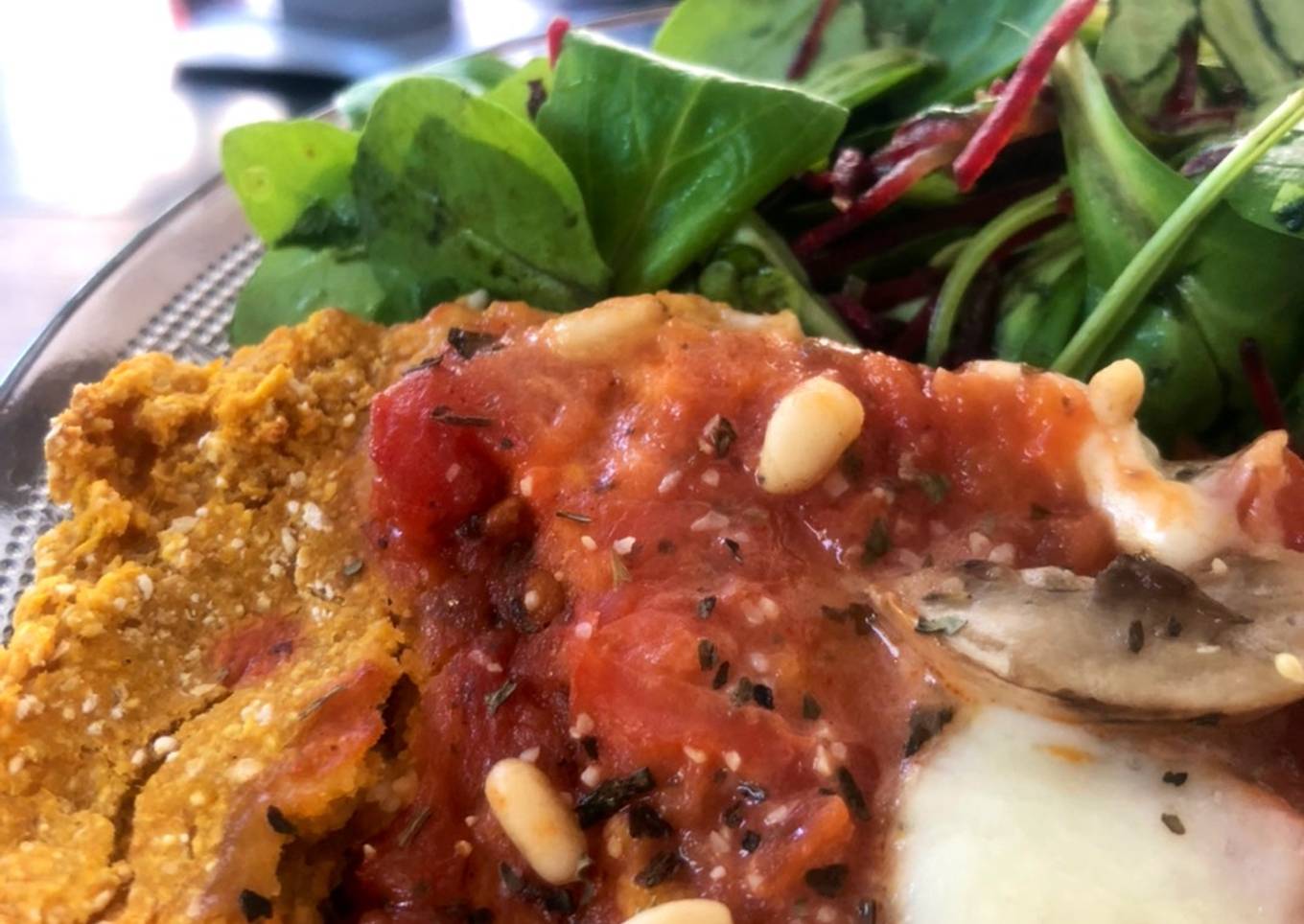 Pizza avec pâte à pizza vegan patates douces et flocons d’avoine