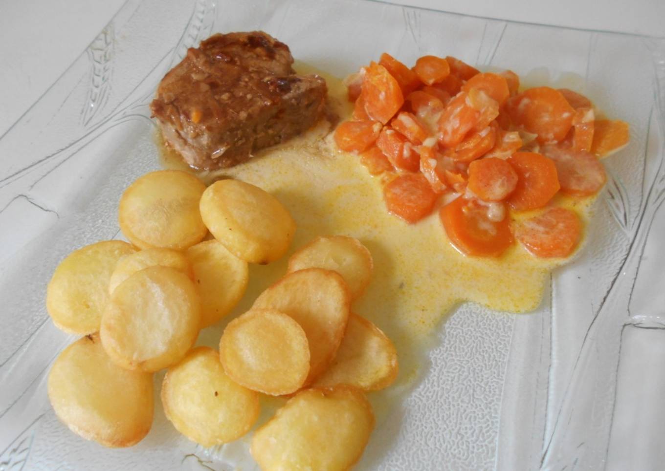 Filet mignon mariné, pommes soufflées et carottes a la crème